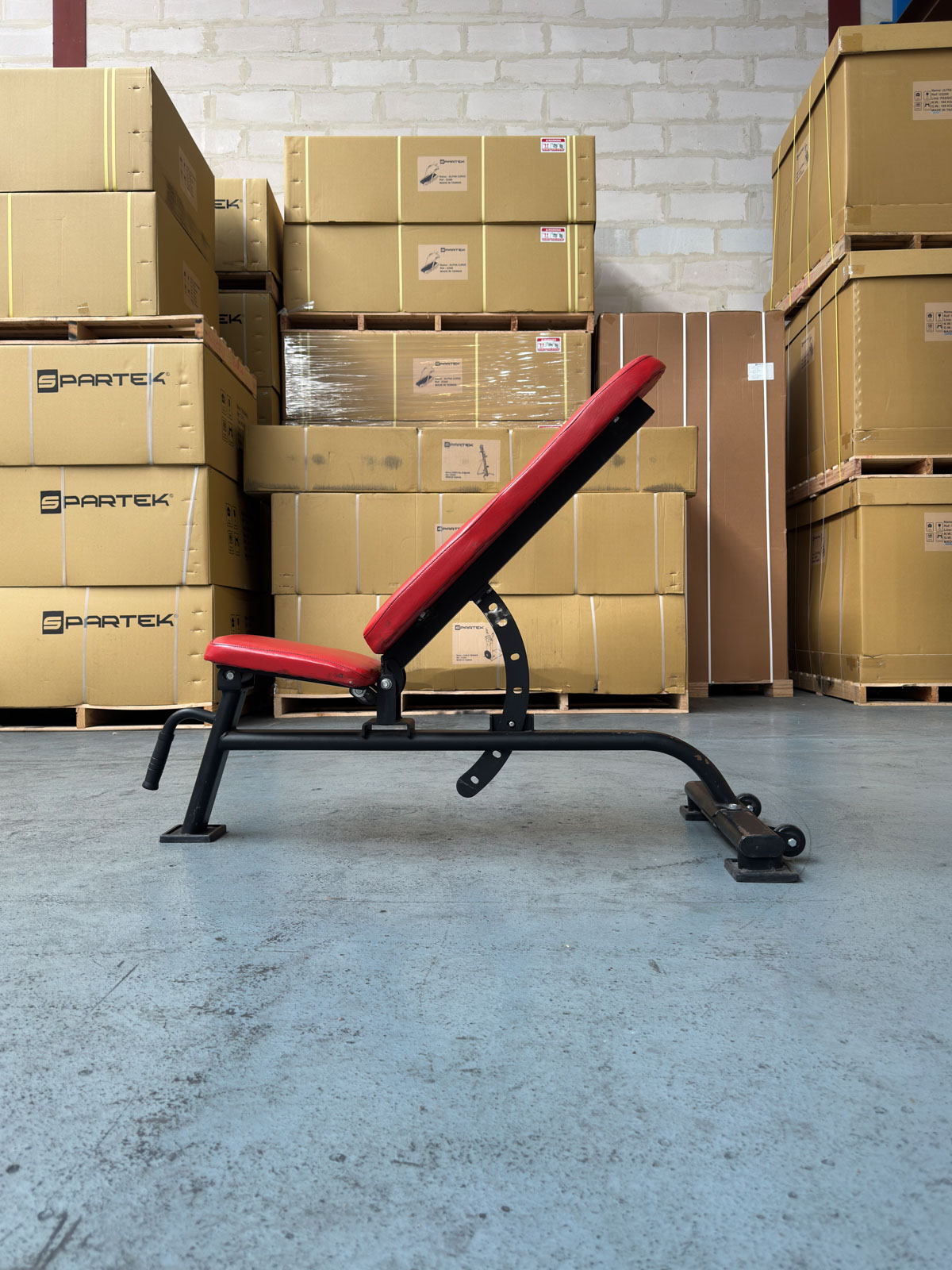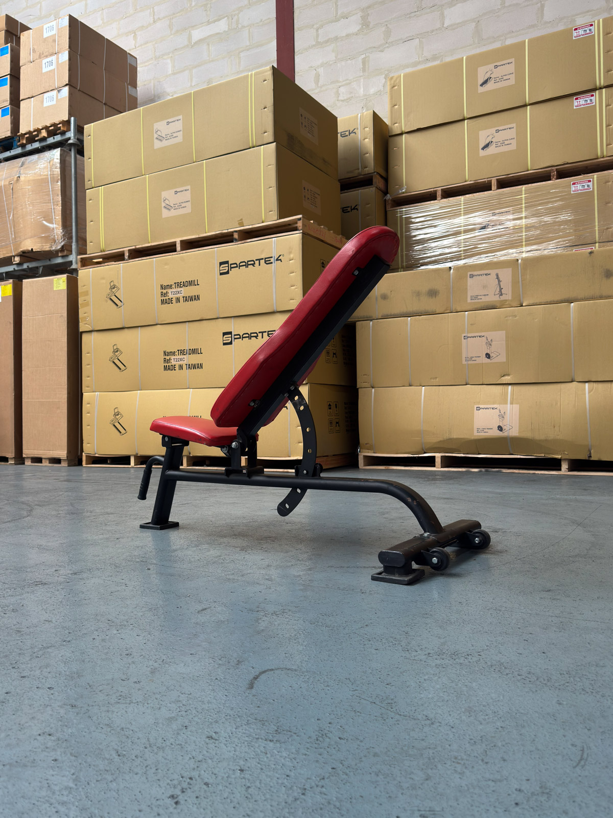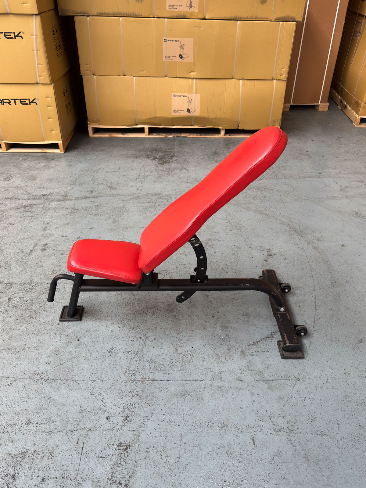 L’ergonomie a été privilégiée avec une assise également réglable en inclinaison, évitant à l’utilisateur de glisser lors des séances de développé incliné. La sellerie rouge haute densité offre un excellent support ferme et une résistance accrue à la transpiration et à l’abrasion. Pour faciliter le déplacement et l’optimisation de l’espace, ce banc est équipé de roulettes de transport à l’arrière et d’une poignée de préhension à l’avant. C’est un matériel de seconde vie fiable, combinant esthétique dynamique et durabilité professionnelle.