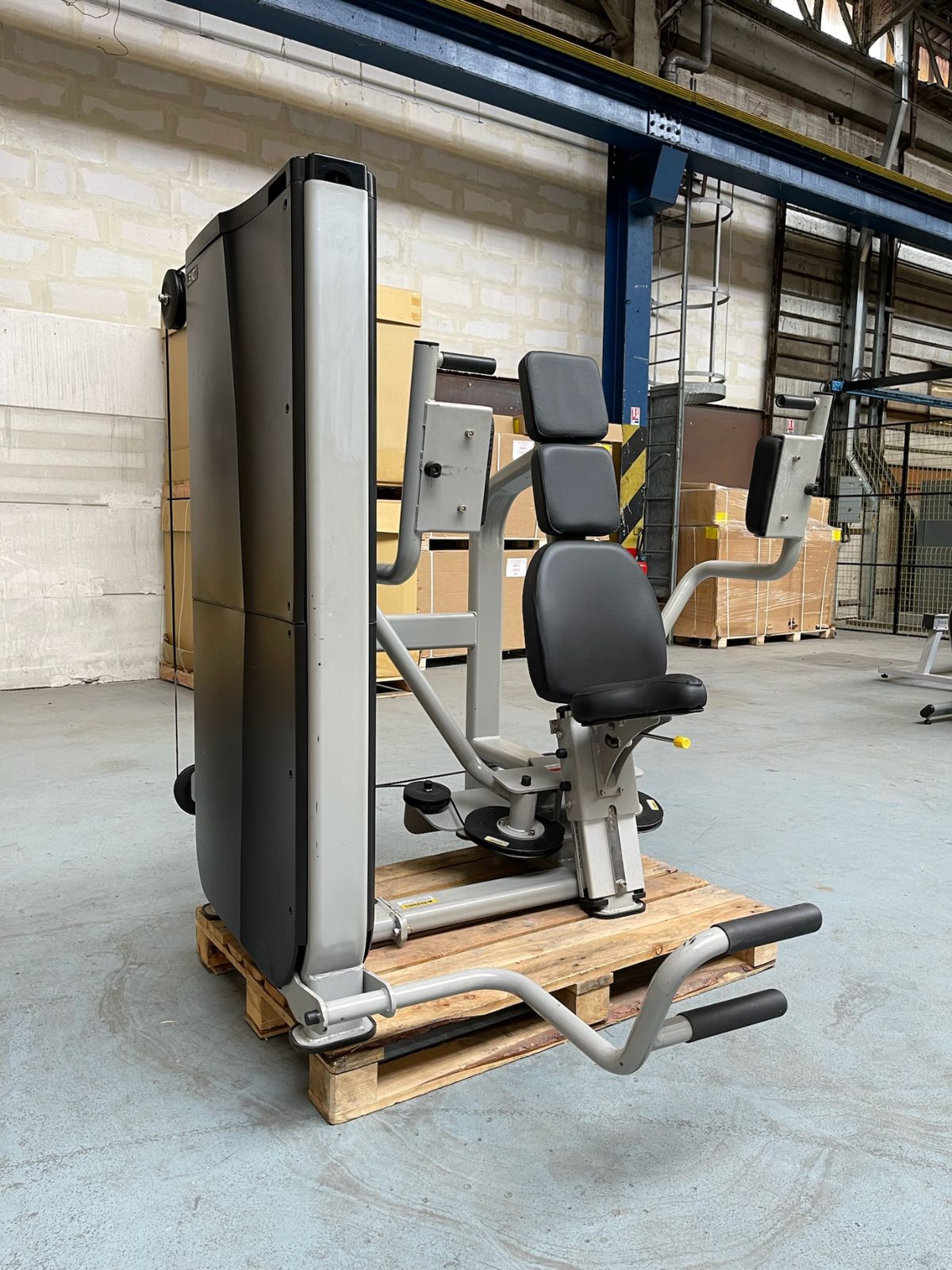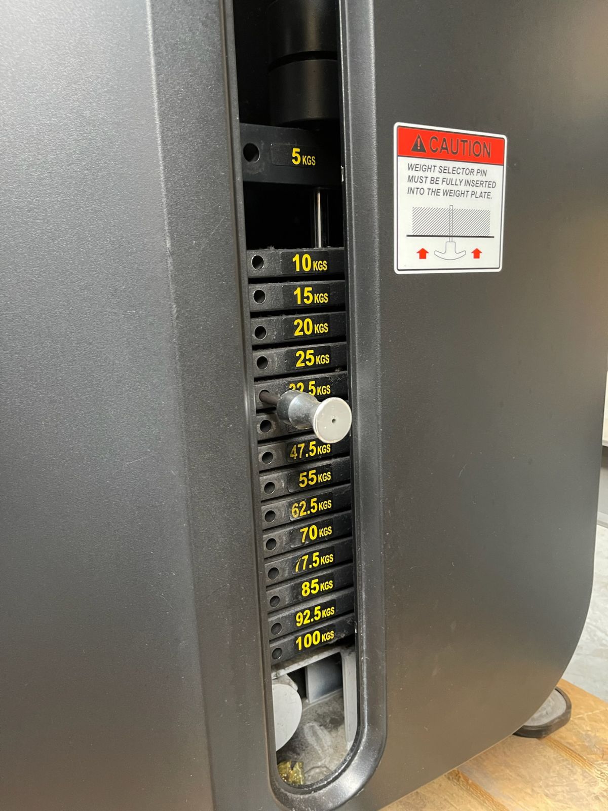 L’ergonomie a été pensée pour un confort total : le dossier vertical divisé en trois sections offre un maintien lombaire et dorsal optimal, tandis que le siège est réglable en hauteur via une goupille rapide (jaune) pour aligner parfaitement les épaules avec les axes de rotation. Les poignées antidérapantes permettent une prise ferme et sécurisée. La tour de poids, entièrement carénée, abrite une colonne de 100kg avec des incréments précis pour une progression constante. Son design gris métallisé et noir apporte une touche de professionnalisme durable à votre plateau de musculation.