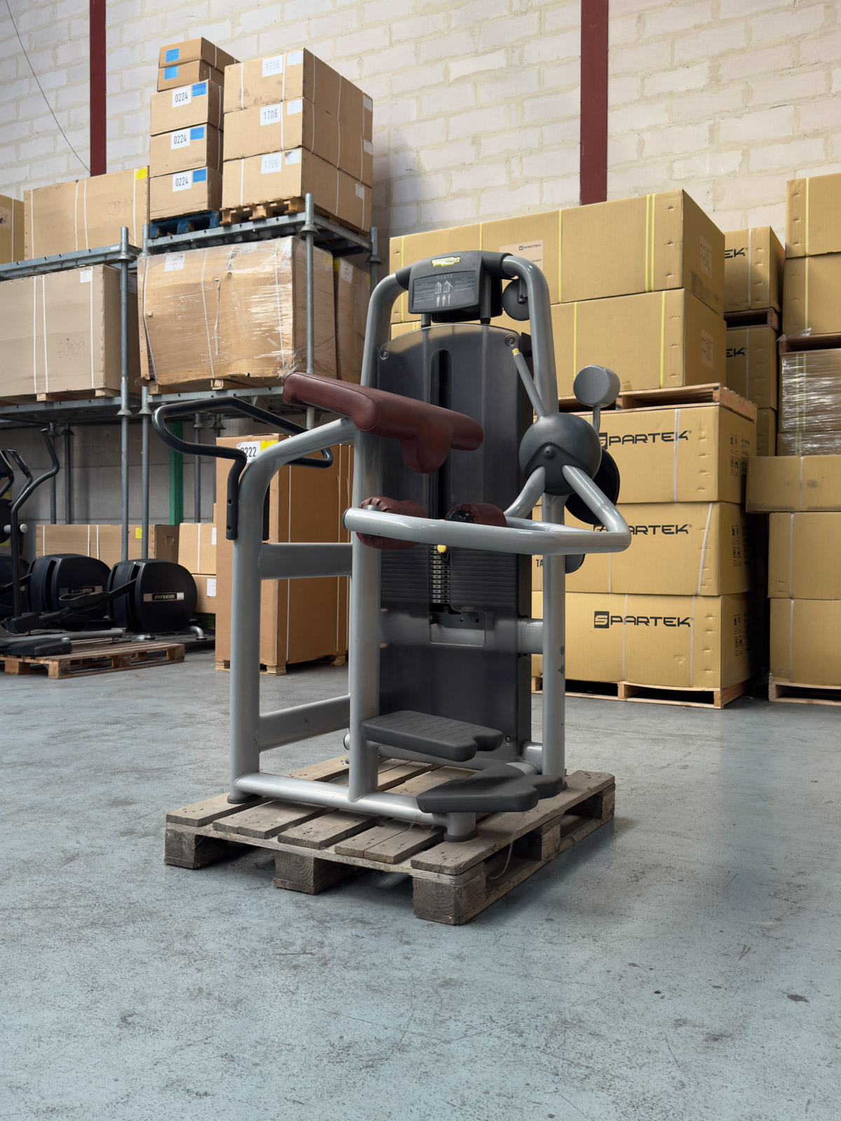 Le levier de réglage ROM (Range of Motion) permet d’ajuster l’amplitude de départ pour s’adapter à la souplesse de chaque utilisateur. La colonne de poids de 70 kg intègre le système de poids fractionné de 2,5 kg (visible sur la photo n°3), idéal pour une progression fine et constante. Avec son châssis Gris Métallisé robuste et sa sellerie Bordeaux haute densité, cette machine combine performance industrielle et esthétique premium pour valoriser votre plateau de force.