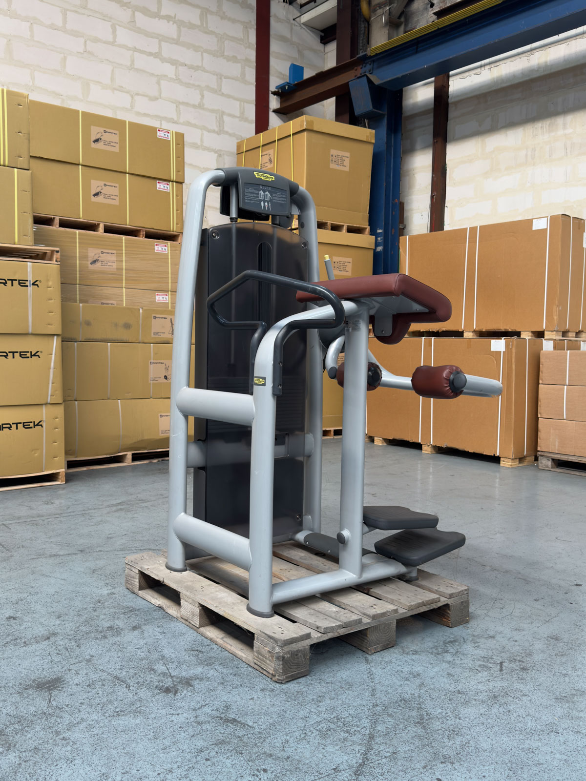 L’ergonomie de la M979 repose sur une position de travail debout avec un appui abdominal et des poignées de maintien larges (visibles sur la photo n°1), garantissant une stabilité totale du buste et une décompression de la colonne vertébrale pendant l’effort. Le mouvement de poussée vers l’arrière suit une trajectoire naturelle qui sollicite intensément la chaîne postérieure sans créer de tensions articulaires.