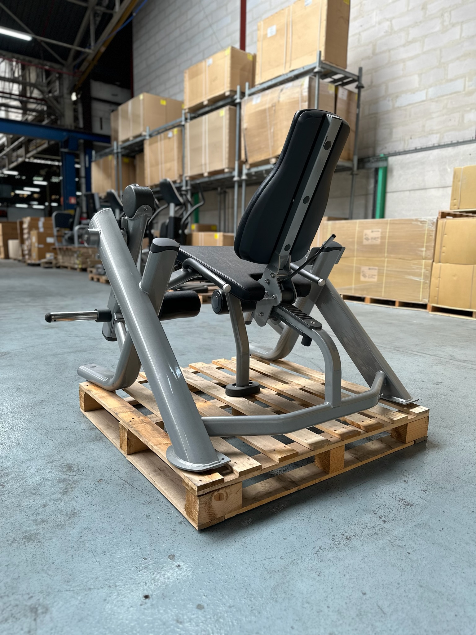 L’ergonomie est poussée à son paroxysme : l’axe de rotation est précisément aligné avec le genou pour minimiser les tensions articulaires, tandis que le dossier incliné à 100° assure une contraction maximale du droit fémoral. La machine dispose de réglages intuitifs pour le dossier et les rouleaux de chevilles, permettant de s’adapter à toutes les morphologies. Sa structure massive en acier gris métallisé et sa sellerie noire haute densité offrent une durabilité exceptionnelle. Avec ses épis de chargement directs, elle procure un ressenti de poids « vrai » sans la friction des câbles, pour une efficacité maximale à chaque répétition.