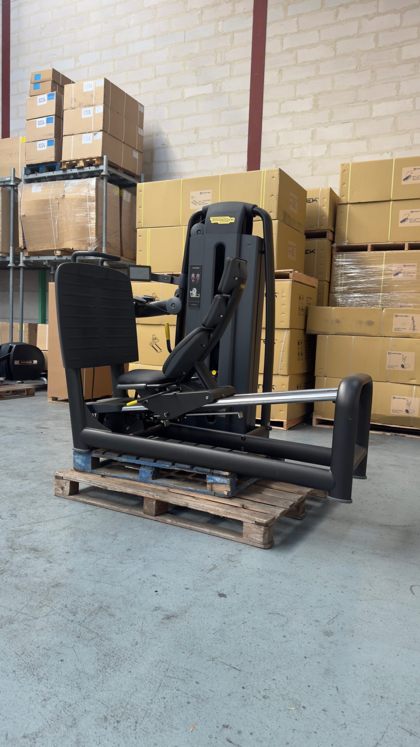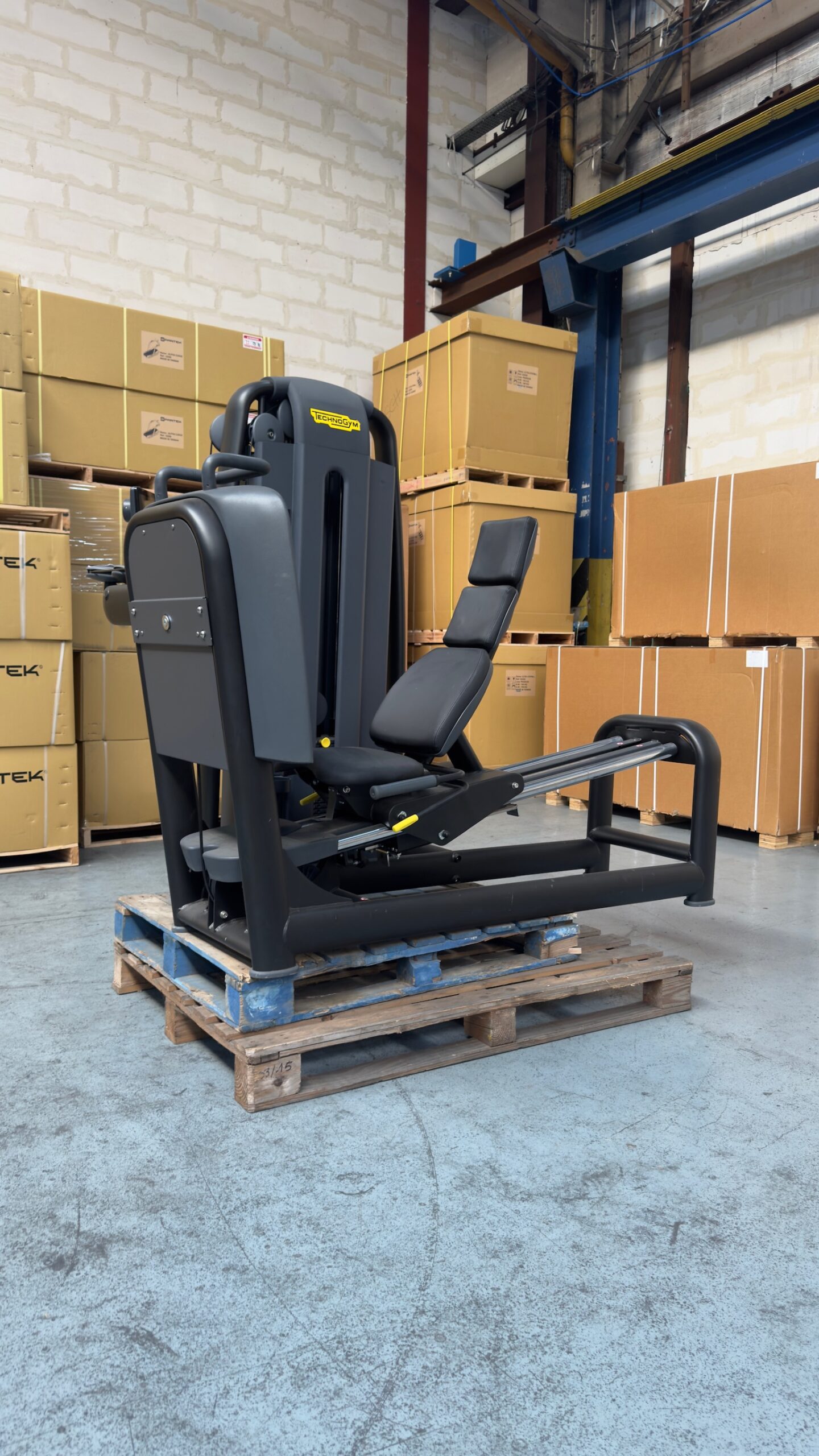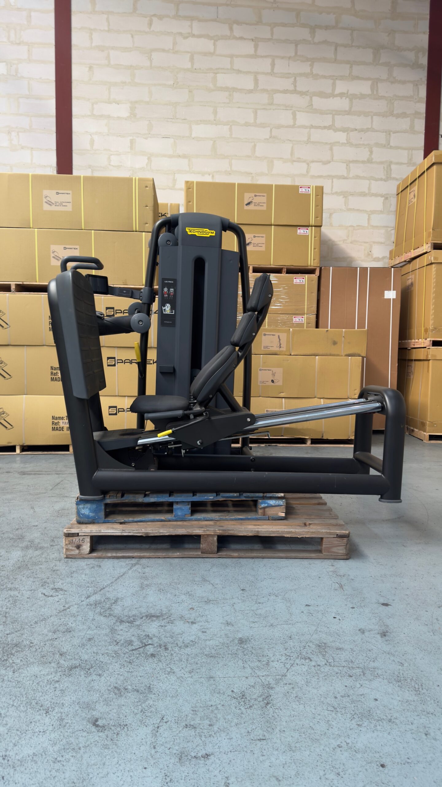 Machine de musculation guidée professionnelle avec charges intégrées (plaques de poids) permettant le renforcement du bas du corps des jambes et notamment des quadriceps.
