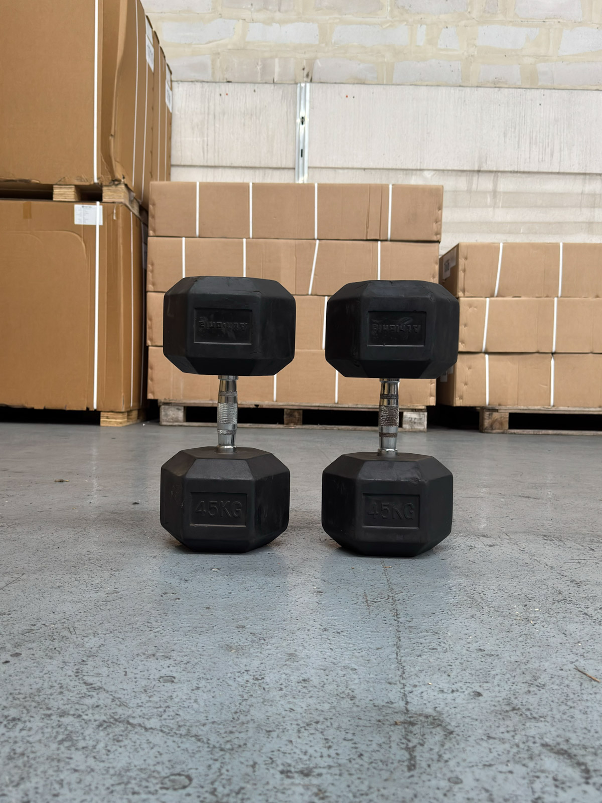 Paire d'haltères hexagonaux professionnels de 45 kg (90 kg au total). Conception monobloc en caoutchouc haute densité avec poignées chromées moletées pour un grip optimal.