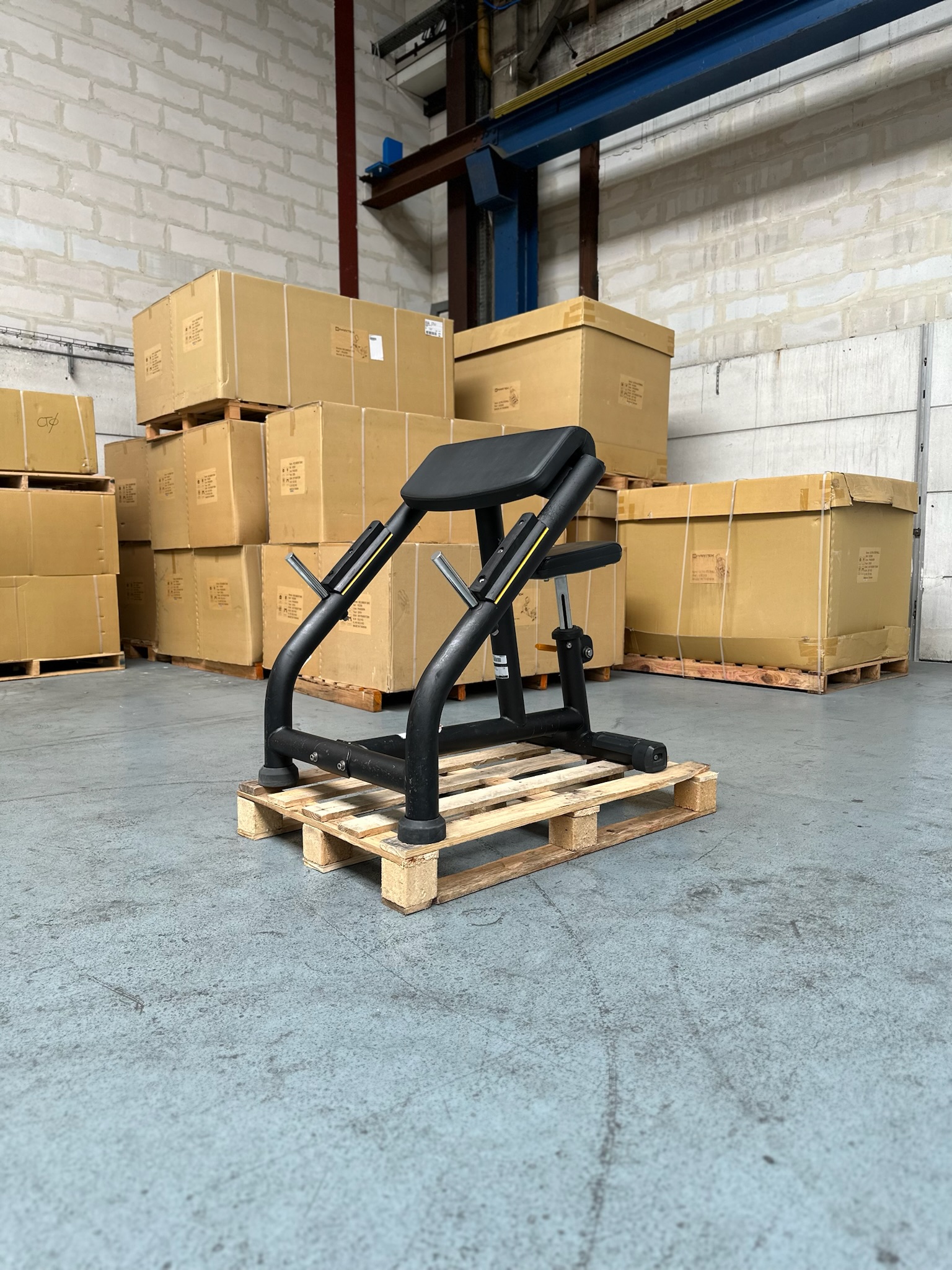 L’ergonomie du MG-A62 se distingue par son large support de bras rembourré avec un biseau inférieur, évitant ainsi toute pression inconfortable sur les aisselles. Le siège est réglable en hauteur par vérin pour assurer un alignement morphologique précis avec le pupitre. Les supports de barre sont équipés de protections en uréthane haute résistance (visibles sur la photo n°1 en jaune) qui protègent le moletage de vos barres et réduisent le bruit lors de la dépose. Sa finition Matte Black intégrale lui confère un look sobre et puissant qui s’intègre parfaitement dans les zones « Poids Libres » ou « Old School » des clubs de fitness les plus sélects.
