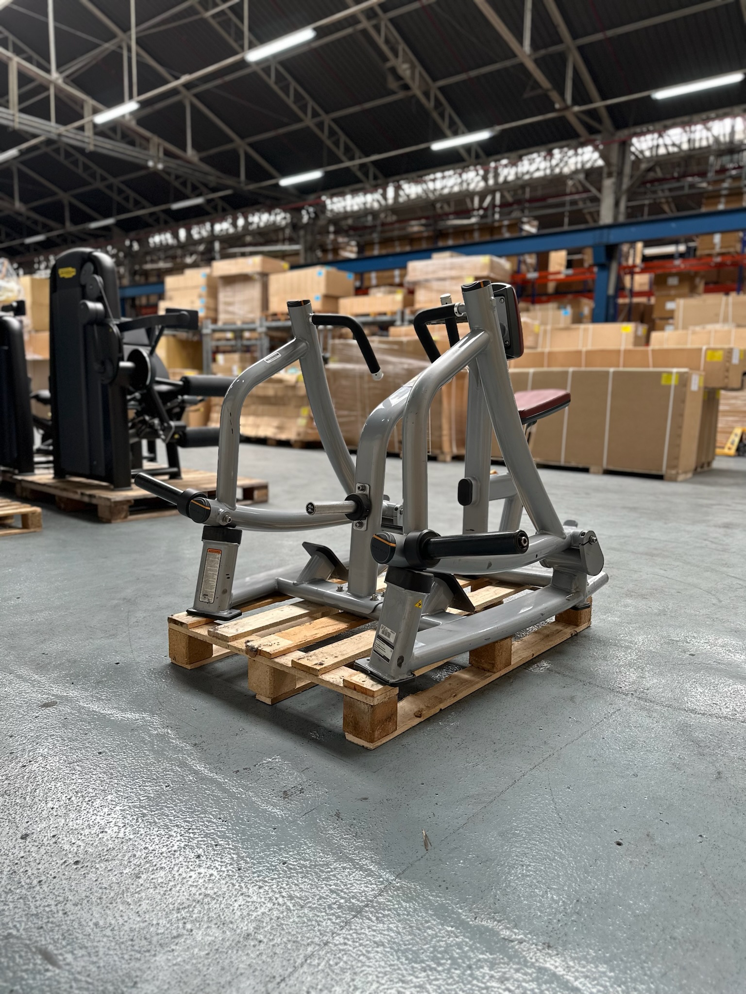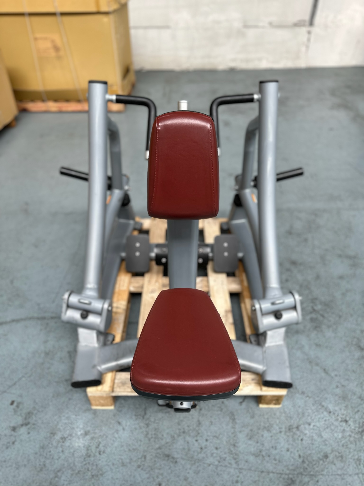 L’ergonomie est au cœur de ce modèle : l’appui thoracique est incliné pour stabiliser parfaitement le buste et éliminer toute triche par balancement, tandis que le siège réglable en hauteur permet d’aligner précisément les épaules avec les poignées. Les poignées multi-prises offrent deux positions (neutre et pronation) pour varier les angles de sollicitation musculaire. Deux épis de stockage sont intégrés au châssis pour garder vos disques à portée de main. Avec sa structure massive en acier gris et sa sellerie Bordeaux haute densité, cette machine est conçue pour supporter des charges extrêmes tout en offrant un confort premium.