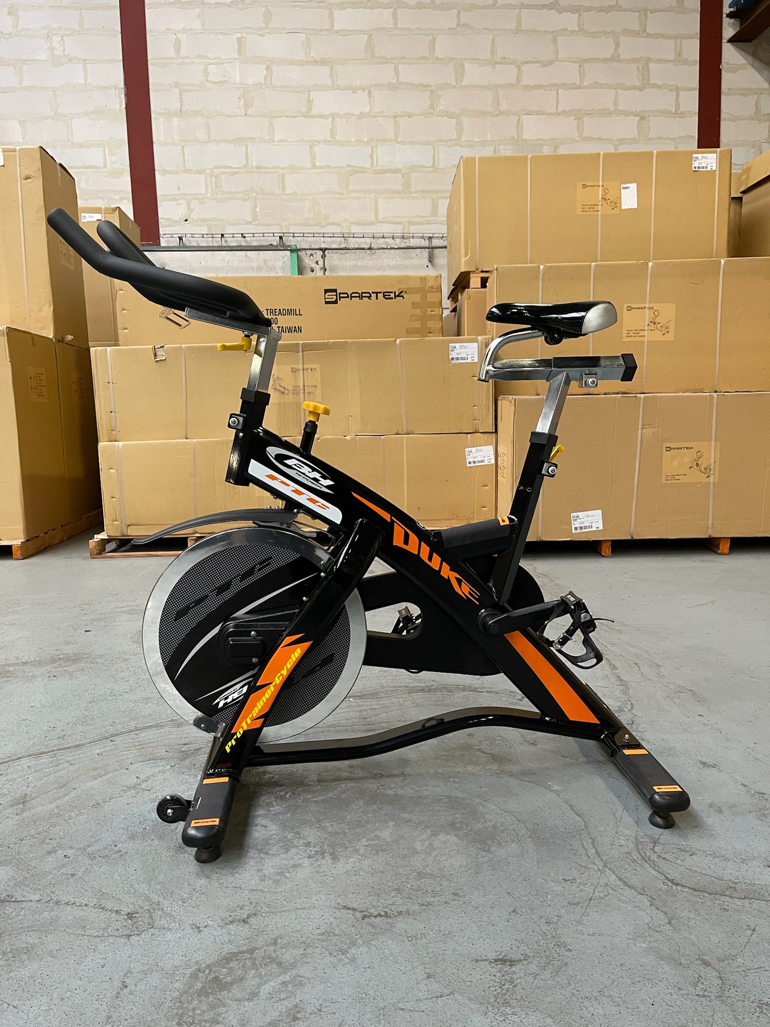 Le châssis est protégé par un traitement anti-corrosion complet, essentiel pour résister à la transpiration lors des efforts prolongés. L’ergonomie est totalement personnalisable : la selle et le guidon de type triathlon sont réglables verticalement et horizontalement (4 directions) pour garantir une posture cycliste optimale. Son pédalier est conçu pour résister aux contraintes les plus fortes, même lors des sprints debout en danseuse. Équipé de pédales mixtes (SPD et cale-pieds), il s’adresse aussi bien aux cyclistes équipés qu’aux débutants. C’est une machine « Heavy Duty » qui combine design agressif noir et orange avec une fiabilité industrielle éprouvée.