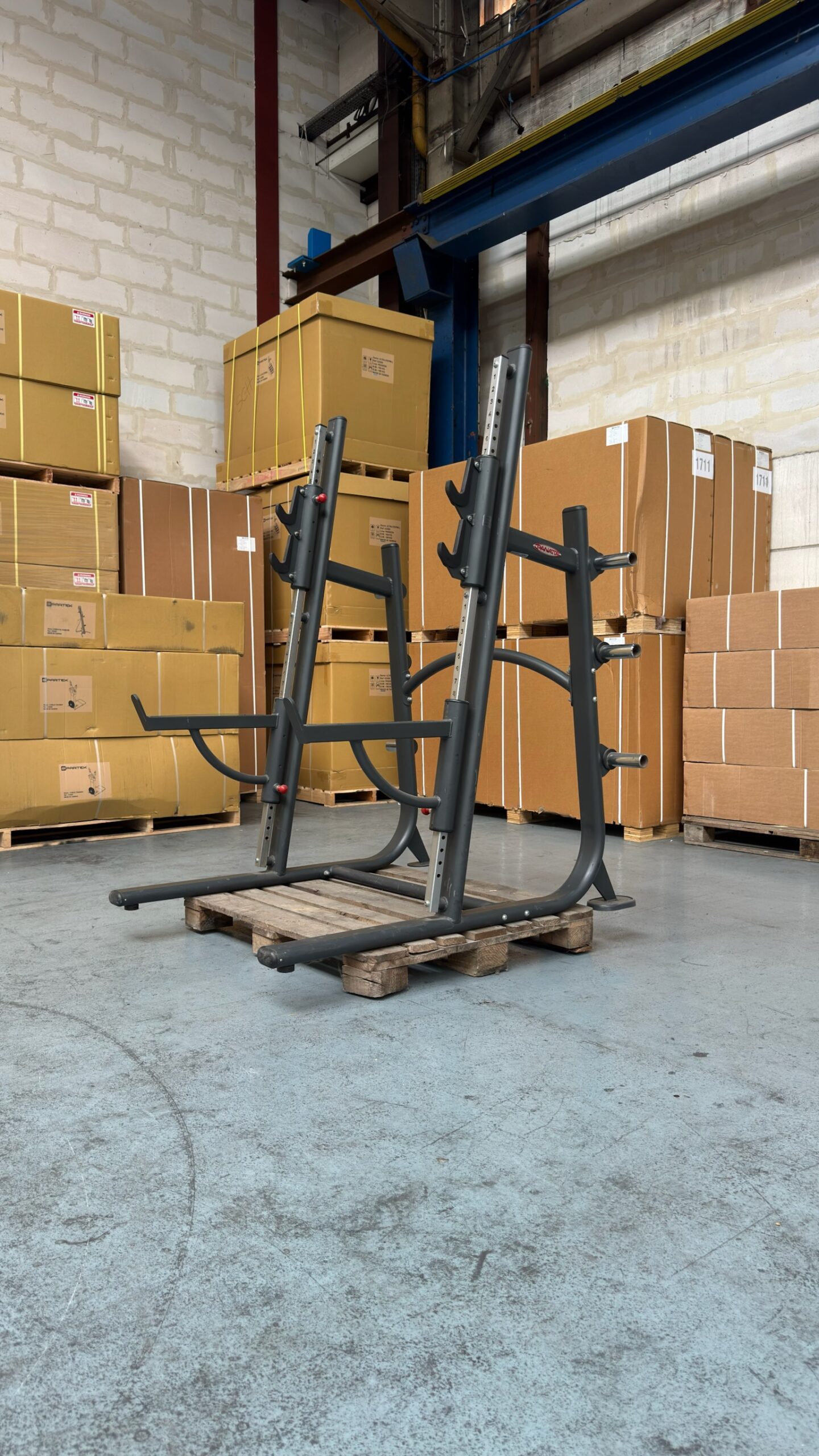 • Sécurité Optimisée : Bras d’assurage (spotter arms) et crochets en J réglables sur montants pour une exécution 100% sécurisée.