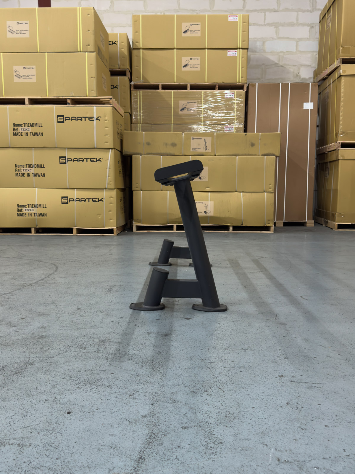 Sa conception à un seul étage est idéale pour être placée le long d’un miroir ou pour créer un îlot central de rangement. Le berceau de support est légèrement incliné vers l’utilisateur pour une ergonomie de saisie optimale, limitant les tensions lombaires lors de la manipulation des poids. Les pieds larges et robustes assurent que le rack ne bouge pas d’un millimètre, garantissant un environnement d’entraînement serein et ordonné.